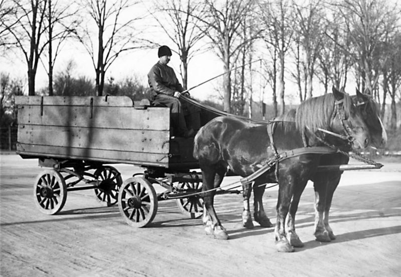 Fotografi. En lastvagn med kusk och två hästar, ägd av Carl F. Jönssons Åkeri i Malmö.