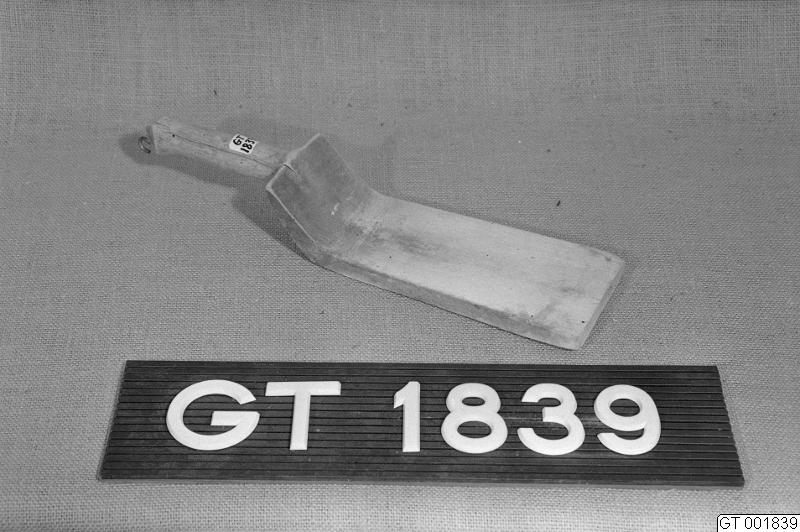 Klappeträ med rakt, uttäljt handtag med nedåtvinklat blad, något bredarenedtill.