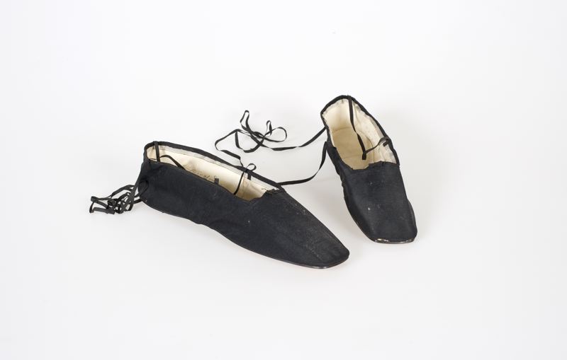 Ett par skor med sula av brunt läder utan klack; ovanläder av svart siden, snörband av svart siden framtill en liten rosett, foder av vitt skinn. I ena skon en oval sedel med tryckt text; Rue Neuve des Petits-Champs 46, GREDER, Sr dr SCHENCK, chausseuv pour Damell BREVETÉ, Fournisseux de plusieurs Cours Elsaugeres Paris. Under etiketten står det skrivet för hand "gauch" i den andra skon står "droi...