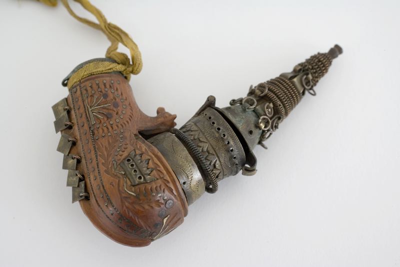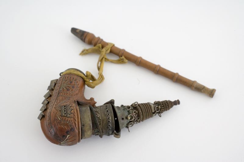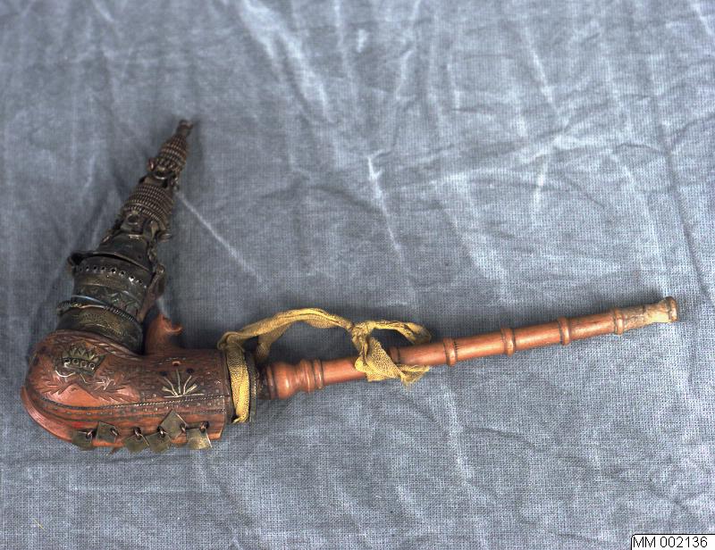Pipa av trä med pagodformat lock i filigranarbete av mässing medhängande ringar. Skaftet med mässingsinläggningar och ett snidathundhuvud.
