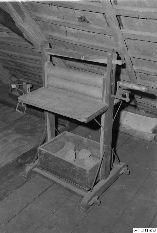 Av mindre typ. Liggande fotträn med två grova, höga sidostolpar med snedsträvor av rundjärn. Höj- och sänkbar låda för sten nedtill. Upptill tre trärullar, varav den mittersta är fast med genomgående axel och S- svängd vev av järn med svarvat trähandtag. Litet rektangulärt, horisontellt bord framtill.
