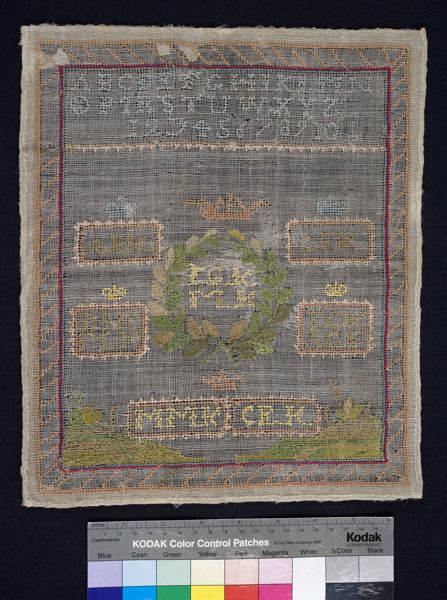 Märkduk, broderi i flera tekniker av silke på gles stramalj av ylle. Korssöm + petits-points. Värde kr. 3:-. Tillverkad ca. 1797. 1800-1805. ABK CSK FGK MK DIK TOK FGK AGK Initialerna i mittem FGK - MK = föräldrarna Frans Georg Krook född 1758, tullförvaltare i Ystad, död 1809 och hans hustru Maria Krook född 1762 död 1816. DIK = morfar Daniel Johan Krook född 1732, advokatfiskal, död 1819. FGK = farfar Frans Georg Krook född 17 ?, kronofogde. TOK = bror Thomas Otto Krook född, ryttmästare, död 1841. AGK = bror Anders Gabriel Krook född 1800, ryttmästare, död 1886. MMK = Maria Margareta Krook född 1790 död 1871. CEK