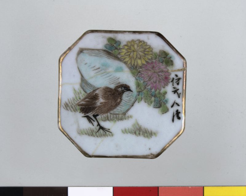 Skrivuppsats för tusch och färg av porslin med dekor i färger. Enåttakantig ask med lock.