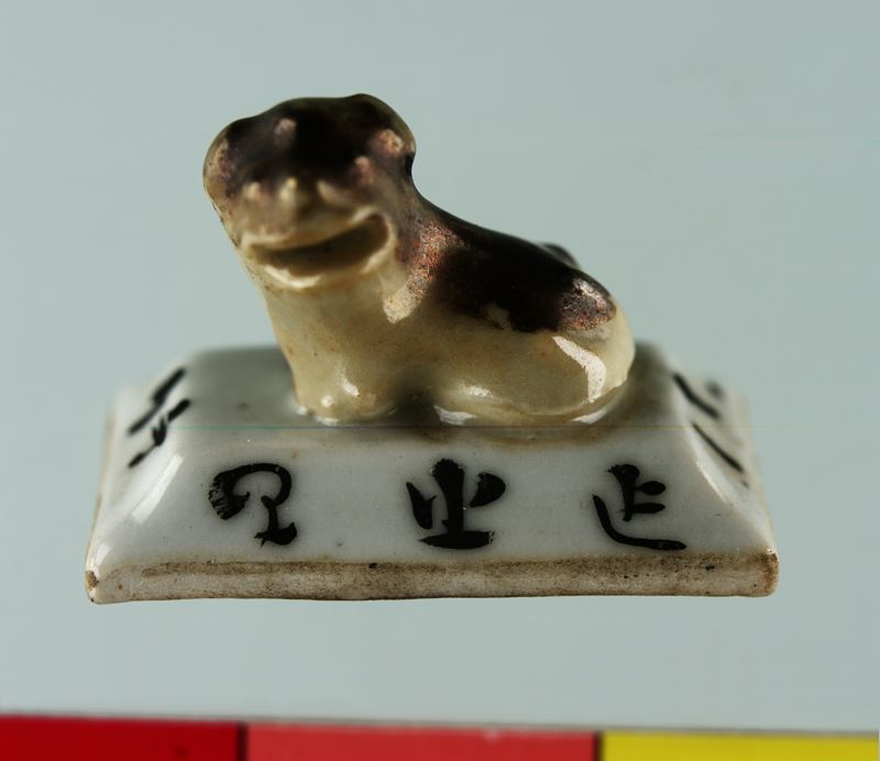 Skrivuppsats för tusch och färg av porslin med dekor i färger. En skålpå fyra ben med lock.