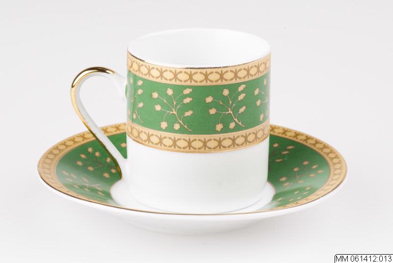 • Kopp med grön dekor. Avsedd för turkiskt kaffe eller te.Tryckt dekrobård i grönt och gult runt fatet och koppen. öra gulddekor. Fat och kopp stämplad: Fine ceramic THE MUST