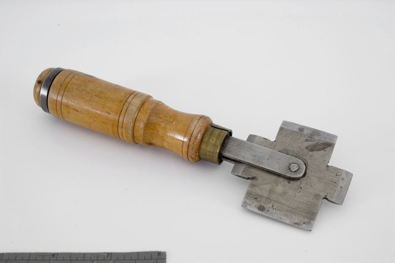 • Knapphålsjärn med skaft av trä. Ett blad med fyra olika järn med vass egg för att göra hål för knappar. Bladet går att rotera och sätta i läge med hjälp ab en liten skruv.