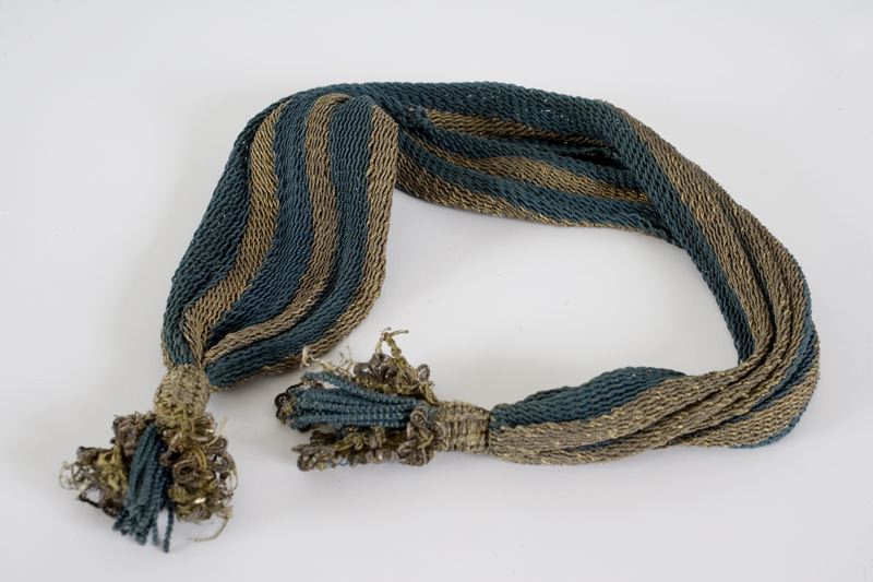 Penningpung, (börs, strumpmodell), i srångteknik av guldtråd och blått silkei längsgående ränder. Ändarna avslutas med fransar och blommor av metalltråd.