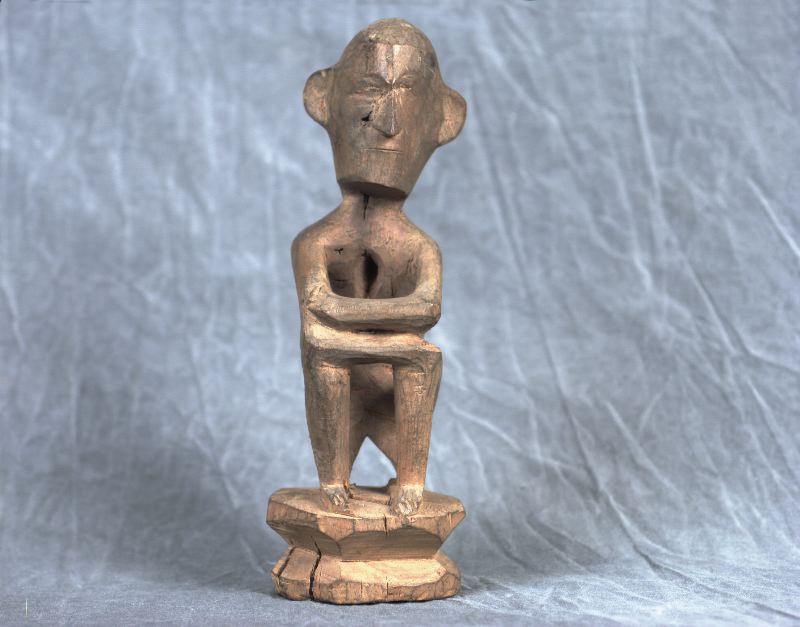 Sittande människofigur av snidat trä.Utställd på Kommendanten under "Sommarakademin" 31/8 - 4/9 1998.Utställd i "Centrummet" i utställningen "Främmande föremål" 30/10 1998 -17/1 1999.