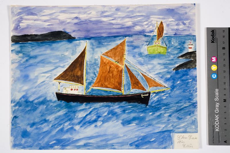 Barnteckning, akvarell föreställande ett segelfartyg i sjönöd Skrivet med bläck på framsidan: Sten Sax / 12 år / Ellös Skrivet med bläck på baksidan: Lärare: Anna Jansson / Elevantal: 18 st / Ellös folkskola, klass 6 / Skolform: A Teckningen är en av de barnteckningar som deltagit i Folket i Bilds teckningstävlan 1954 och som sedan ställdes ut på Malmö Museer. Folket i Bild arrangerade varje år fr.o.m. 1938 och minst 20 år framåt, en teckningstävlan för skolbarn varje år med olika teman.1954 års tema var "Nära ögat". Urvalet gick till så att läraren för varje klass som deltog gjorde en grovsortering av det erhållna tävlingsmaterialet och sände in dessa till en speciell jury. Efter jurygranskning blev det utställning av de utvalda sakerna på Nationalmuseum och sedan vandrat runt på olika museer i Sverige. Märkt på baksida av katalogkort: Utst. MM. HT 1955.