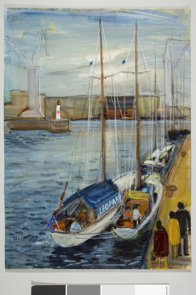 Vi befinner oss vid Hullkajen i Nyhamnen och ser t.h. i förgrunden akterspeglarna på fem mindre segelbåtar förtöjda vid kajen som sträcker sig uppåt längs höger bildkant. Ytterst i raden ligger den engelska båten Leopard med sitt namn på sidan av den blåmålade kajutan och den engelska flaggan i aktern. Innanför denna ligger en lite mindre båt intill kajen. I vardera båt syns två personer i aktern....Visa hela