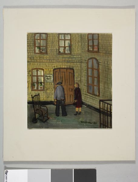 Vi befinner oss på gården till Lilla Kvarngatan 5 i Gamla Staden och ser ingången till Malmö Stadsmission i gårdshörnet där två vinkelställda hus möts. Dörren är ganska bred och utförd i trä i tre sektioner. Bredvid t.v. sitter en skylt med texten "Kontor / Öppet / 12-14, 20-22". Framför dörren ser vi ryggtavlan av en äldre man i enkla kläder och en kvinna i mörkröd kappa vänd i profil mot honom. I nedre vänstra hörn syns på gårdsplanen en rullstol av äldre modell. I nedre högra hörn syns hörnet på ett vinklat järnstaket. Själva huset är byggt i ockragult tegel med rödbruna fönsterbågar och dörr. Bilden är beskuren upptill vid två våningars höjd.