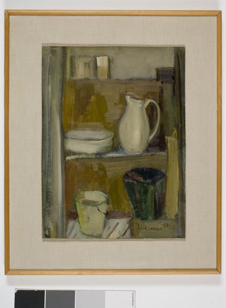 • Vi befinner oss i fröken Jeppssons lägenhet på Rörsjögatan 28 i Gamla Staden, där ÅWL har gjort en stillebenmålning av fröken J:s tvättvrå. På golvet, eller på ett litet bord t.v. ser vi en gul emaljerad hink med gröna kanter. T.h. om denna står på golvet en lite större grönsvart behållare intill något odefinierat gultonat. På en hylla ovanför står ett porslinsfat och en kanna. Ovanför och t.h. o... Visa hela
