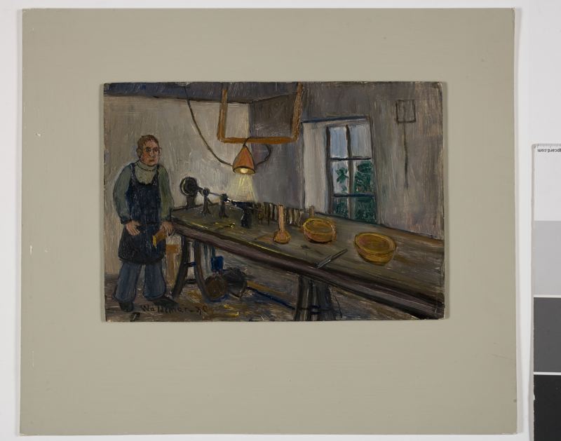 Vi befinner oss i svarvare K.E. Dahlströms verkstad på Gottfridsgatan 10 på Lugnet. Vi ser Dahlström stående vid vänster bildkant, vänd mot oss, klädd i grågrön tröja, blå byxor och ett mörkblått arbetsförkläde, med ett arbetsstycke i handen. Han står invid kortändan på ett långt arbetsbord som sträcker sig utanför höger bildkant. Vid kortändan är en svarv monterad, på bordet ligger arbetsstycken ...