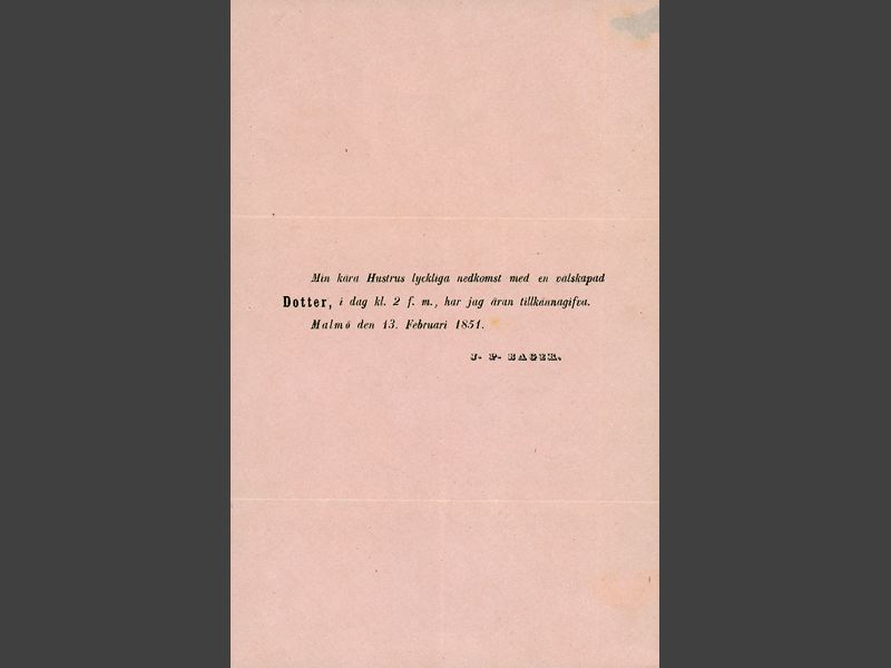 Tillkännagivande av nedkomst av barn av rosa papper. Text:" Min kära Hustrus lyckliga nedkomst med en välskapad/ Dotter, i dag kl. 2 f.m., har jag äran tillkännagifva./ Malmö den 13. Februari 1851.Undertecknat: " J.P. Bager." Barnet som fötts var Bertha Elisabeth Mariana Bager (1851-1852), dotter till handlaren Johan Peter Bager och hans hustru Amalia Quensel.