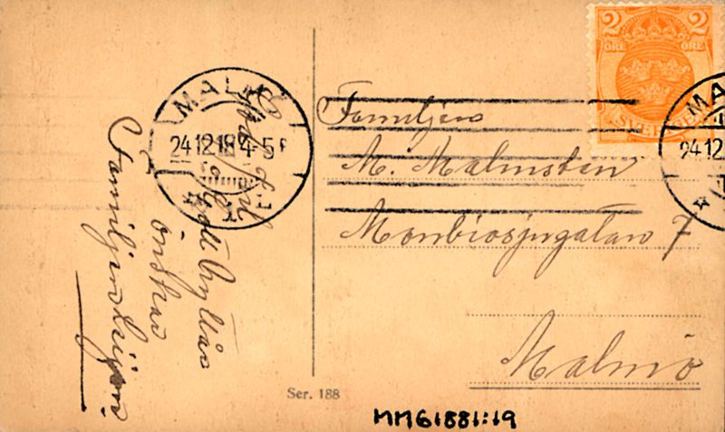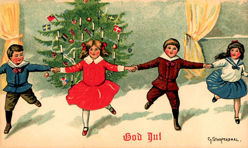 Julkort, tryck på kartong. Motiv föreställande barn dansande runt julgran. Tryck text på framsida; God Jul. Handskrift på baksida. Poststämplat i Malmö 1918.