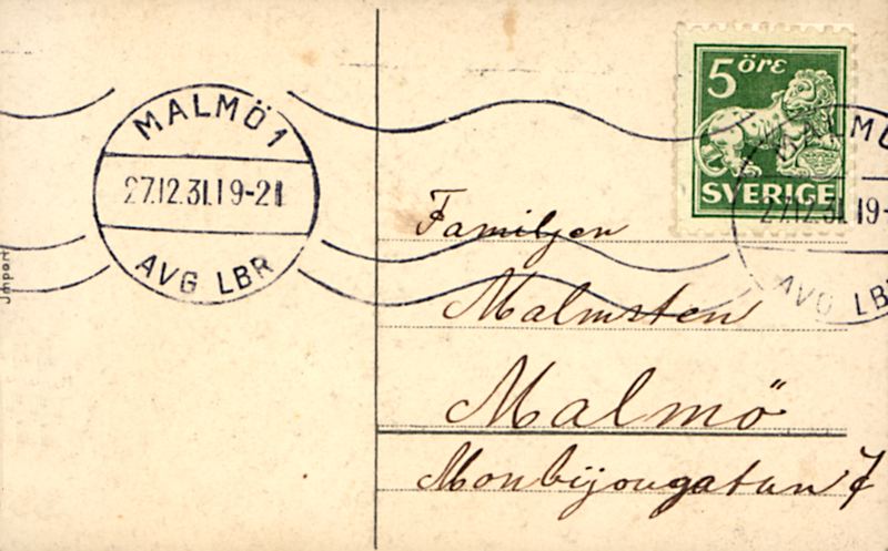 Julkort, Nyårskort, tryck på kartong. Motiv föreställande vinterlandskap i skogen om natten med fullmåne. Tryck text på framsida; Glad Jul och gott Nytt År tillönskas av Ida A. Handskrift på baksida. Poststämplat i Malmö 1931.