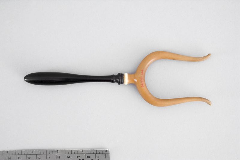 Gimpgaffel av fläder? oxel? ask? päron? med ring av elfenben och skaftav ebenholz eller svartbetsat trä.Föremål avbildat på katalogkort.