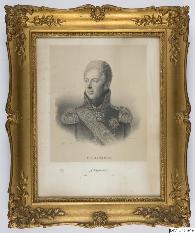 Den avbildades namn finns tryckt i bilden (i litograferad tryckstil): J.A. SANDELS, samt strax nedanför (i litograferad skrivstil) flankerat av födelse- och dödsdatum: Joh Aug Sandels. * 31/8 1764. + ...