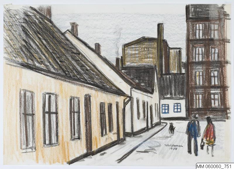 Vi befinner oss på Lorentzgatan i Lugnet och vänder blicken åt väster. Vi ser gatan sträcka sig i snett perspektiv från nedre vänstra hörn in mot mitten av bilden där den mynnar ut i den tvärsgående Västra Långgatan. Vi ser två envåningshus i kv Orren t.v., det närmsta i gultonad puts och det bortre i vitt. Mellan husen finns ett smalt prång. Ute på gatan syns i nedre högra hörn ett flanerande par med en hund i koppel. Utmed Västra Långgatan syns en liten del av bebyggelsen i kv Elefanten. T.v. ett envåningshus i vit puts med blå fönsterbågar och tak av svart tjärpapp. T.h. om detta ett fyravånings hyreshus. I bakgrunden syns brandgaveln till ett högt hus.Stäng