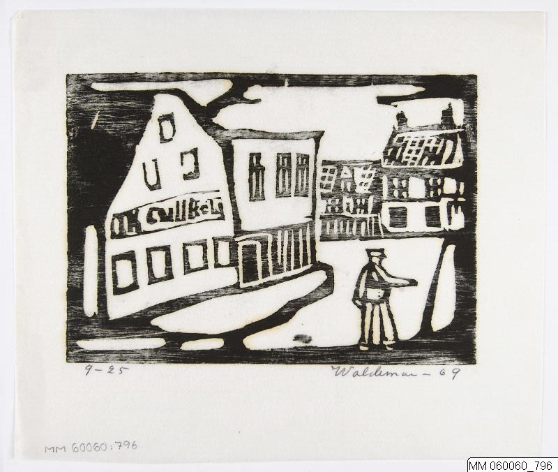 grafik, linoleumsnitt, Västra Långgatan. Gullbergs