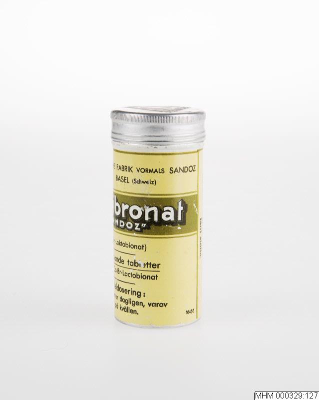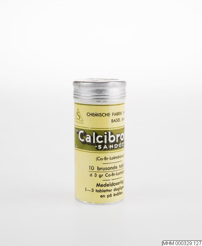 Läkarmottagning för öron- näs och halsspecialist 1900- talets förra hälft. Pillerburk av plåt med skruvlock. Burk för 10 brustabletter Calcibronat. Text: " Chemische fabrik vormals Sandoz / basel (Schweiz) / Calcibronat / Sandoz / (Ca-Br-Laktobionat / 10 brusande tabletter / á 3 gr Ca-Br-Laktobionat / Medeldosering / 1-3 tabletter dagligen, varav / en på kvällen. / Tabletterna skola förvaras i väl / tillsluten originaltub på kallt och / torrt ställe. / Bruksanvisning: / Brusande- Calcibronat-Sandoz-tabletter / giva, nyss lösta i ett glas vatten, en / behaglig brusande limonad med lugnan- / de och stärkande verkan. Efter smak kan / även fruktsaft tillsättas.