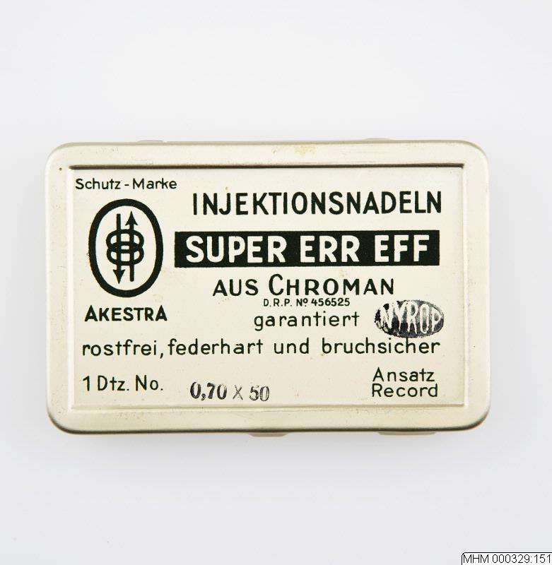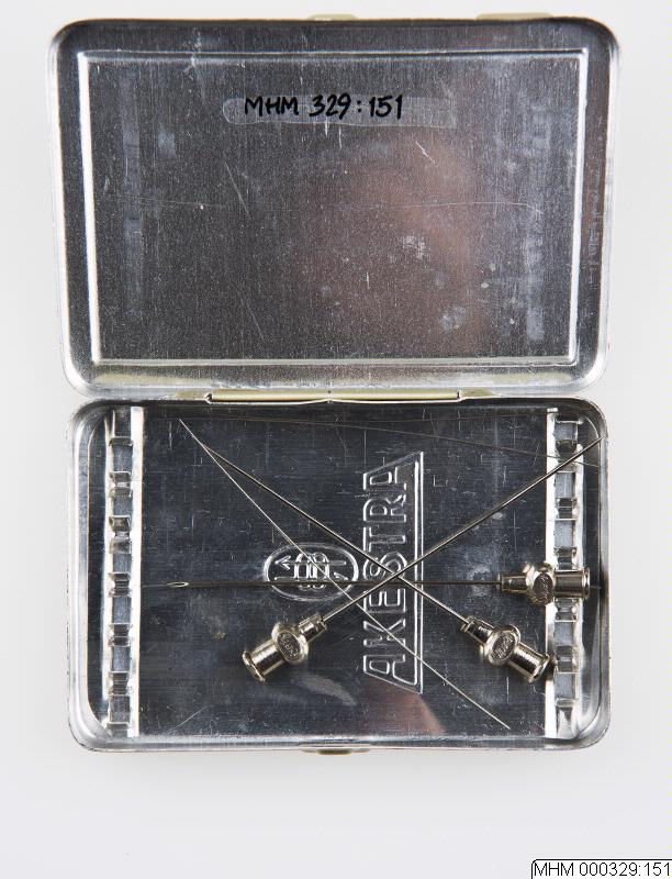 Läkarmottagning för öron- näs och halsspecialist 1900- talets förra hälft.Plåtask för injektionsnålar. Text: "Schutz-Marke / Injektionsnadeln / Suoer err eff / Aus Chroman / D.R.P. No 456525 / Akestra / garantiert / rostfrei, federhart und bruchsicher / 1 Dtz No / 0,70 x 50 / Ansatz / record"