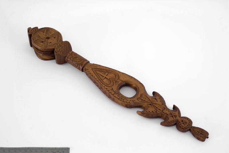 Vävluna av lönn, skulpterad. Omkring mitten av 1700-tal. Jfr. Uppland i Nordiska museet och Upplandsmuseet. Sid 41-46, fig. 50-64 Vävlunor artikel av S.E. (Sigurd Erixson). Museets exemplar erinrar mest om de ganska sena lunorna, silhuetten liknar fig. 60 daterad till 1738 från Rådmansö socken orneringen fig. 57-59 vars dateringar ar 1728 och 1785 ingen av dessa har dock rund trisshållare.