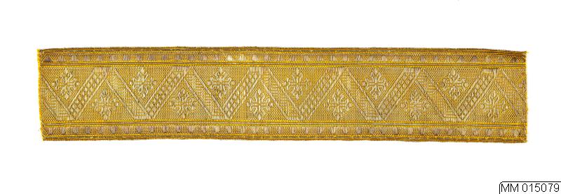 • Band med ripsliknande botten och baksida, invävda guldtrådar i zick-zack mönster och blomliknande ornament, kanterna har "triangelmönster".