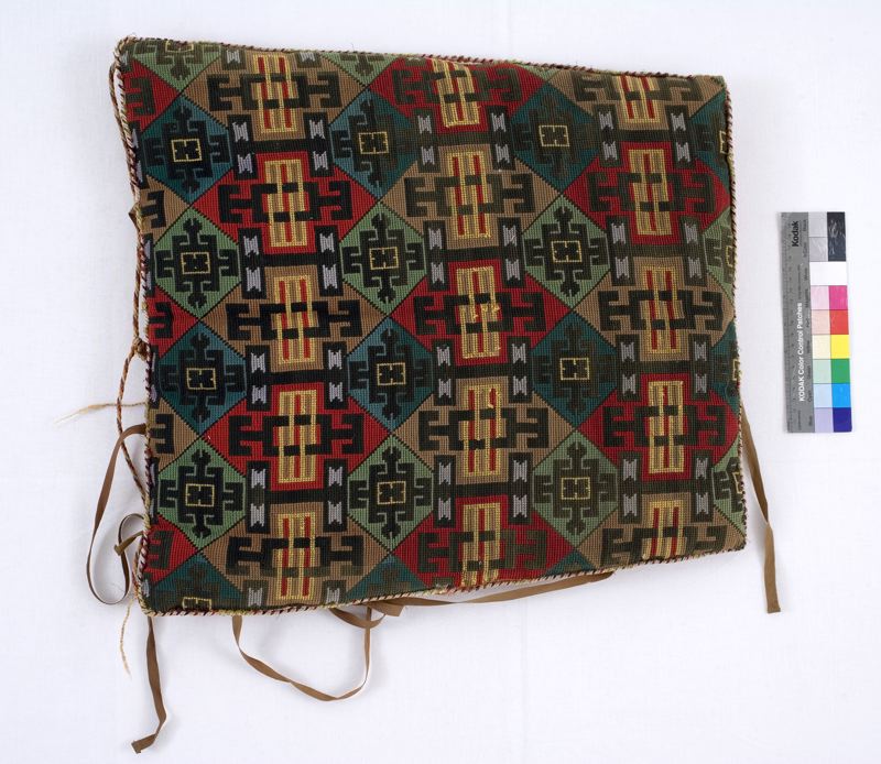 Ryggdyna för gungstol. Stramalj med geometriska broderier i korsstygn av ullgarn i flera färger samt gult silke. Kantad av en snodd av två vita silkessnören och sniljer i gulgrönt, rött och purpur. Fastsydda bruna knytband på flera ställen. Ljust orange yllefoder, trasigt.