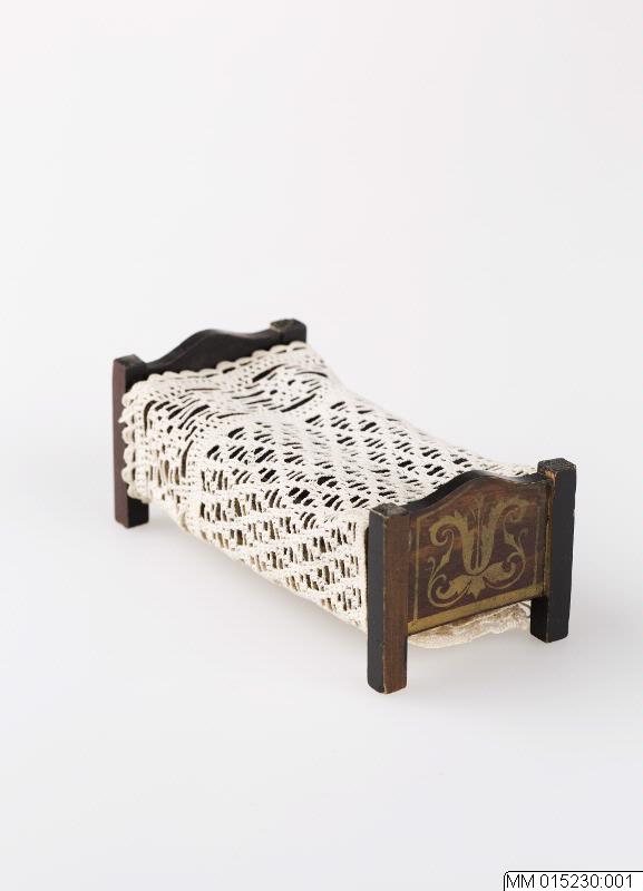 Virkat sängöverkast till dockskåp.Gåva av fru Helena Hagerman, sept. 1928.