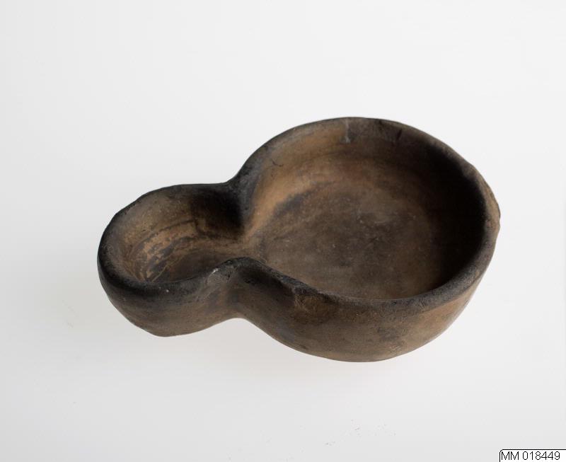 Lampa av brungult lergods. Antik lampform på låg, rund fot. Handtagetavslaget.