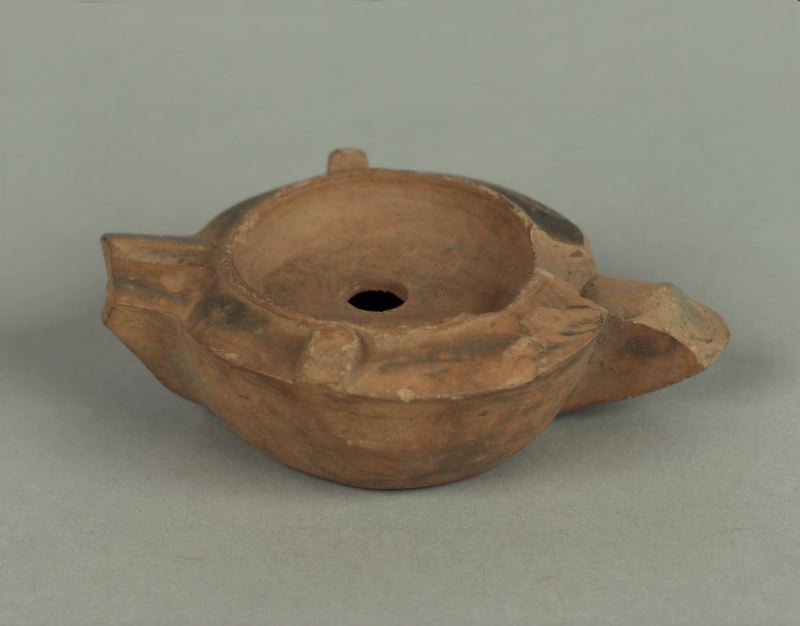 Lampa av rött lergods, antik form, sönder. Märkt i relief i botten:EVCARP.