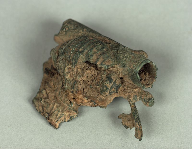 • Fragment av fibula av brons med gjuten och graverad dekor.