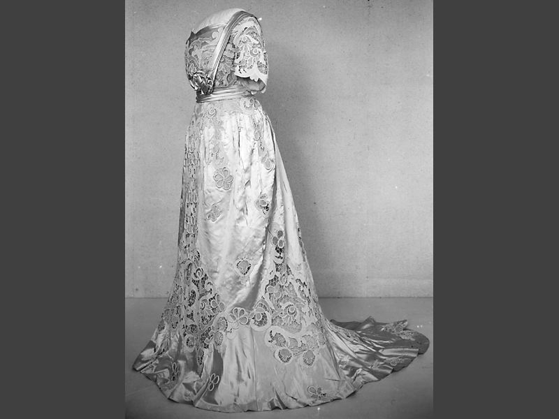 Balklänning av gul sidenatlas garnerad med infällda motiv av bomullsspetsar översydda med langettkonturer. Underklänning av något klarare gult siden. Livet överklätt med gul chiffon däröver spetsar och draperat siden. Djup ringning något spetsig fram och bak. Dold knäppning i ryggen. Kjolen sydd fast vid livet. Skuren i 2 fram- och 2 bakvåder. Infällda spetsar runt höften och mitt fram samt runt k...