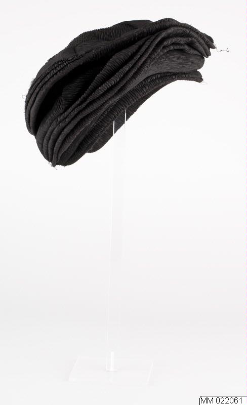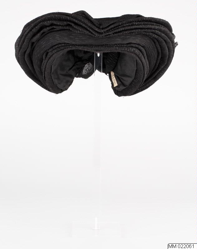 Sorghatt med ställning av karkas, klädd ned crêpe i svart. Foder av svart siden på vadd. Etikett/märkt: Alma Engelbrecht Modeaffär Gamla Torget 2 UPSALA.