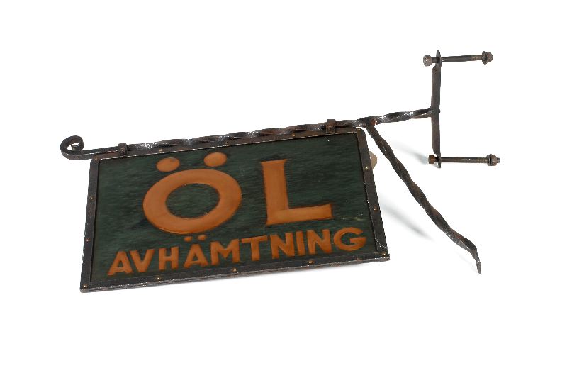 Skylt av koppar med påskruvad ramlist av smidesjärn, upphängd i hållare med 3 fästen av spiralvridet smidesjärn. Plattan patinerad med text i släta, upphöjda bokstäver: ÖL samt därunder AFHÄMTNING.