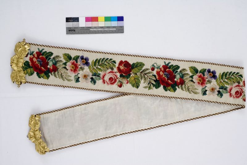 Spjällband, broderi i korssöm av ullgarn i flera färger samt rött ochvitt silke. Foder vitt siden. Beslag av pressad mässing överst och underst.