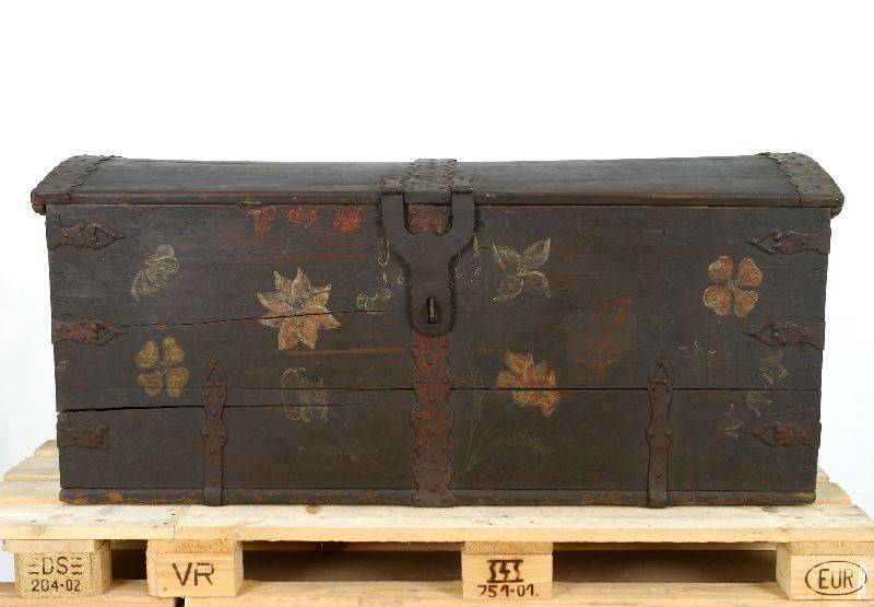 Kista av ek, betsad i svartbrunt, med målad dekor, delvis avnött, i vitt, rött, gult och grönt samt beslag av järn, kantfasonerade och med delvis genombruten dekor. Locket svagt kupigt på två gångjärn av järn. Fyra raka väggar: framsidan och kortsidorna med målad dekor av blommor, på varje kortsida ett böjt handtag av smitt järn, fäst i två järnöglor. Lås och nyckel saknas. Låses med låshake (över...