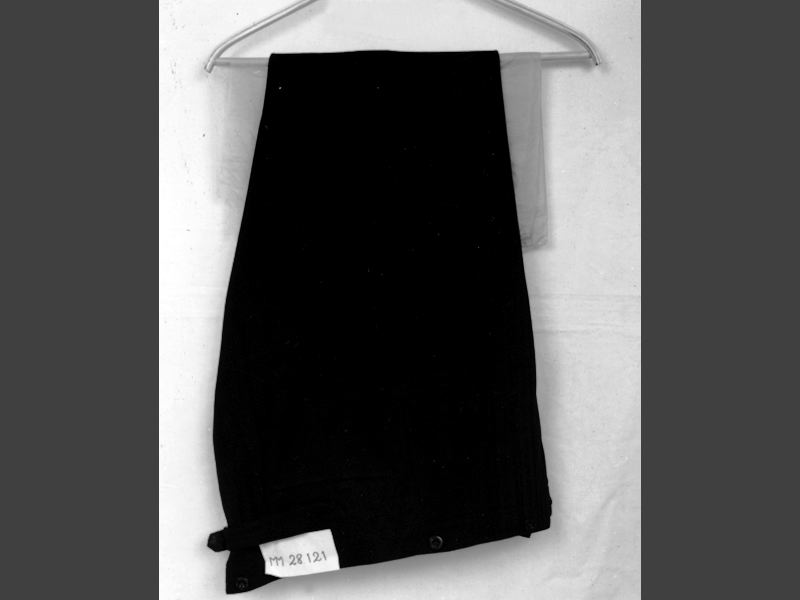 • Byxor, till frackkostym, av svart kläde. Foder upptill av svart satin. Linning. Fickor. Knapparna märkta: THERKELSENS ENKE & SON