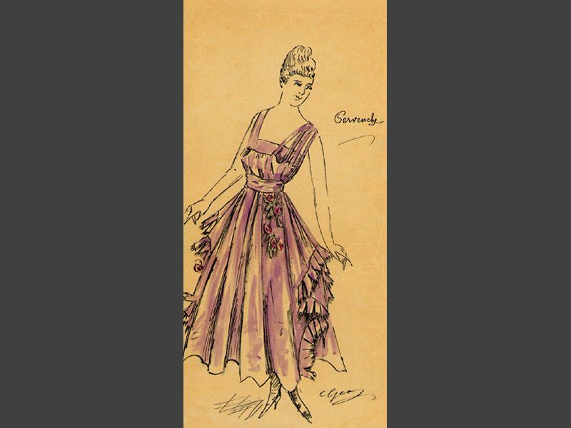 Plansch. "Pérvenche". Jolie robe du soir en gros de Londres mauve. Retroussé sur chaque coté de la robe et souligné par une grosse niche. Corsage trés décolleté dans le dos avec petites epaulettes, et la taille guirlande de fleurs. Prix: 700 frcs.