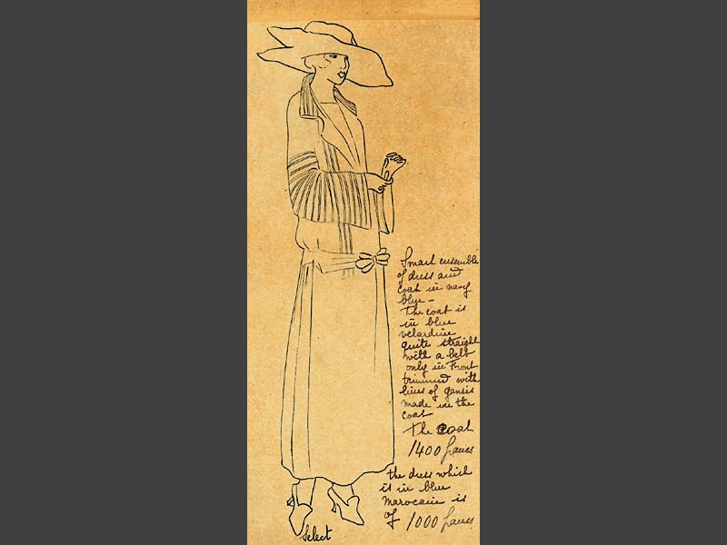Select. Smart essemble of dress and coat in navy blue. The coat is in blue velardine quite straight wih a belt only in front trimmed with lines of gansés made in the coat The coat 1400 francs The dress wich is in blue marocain is of 1000 francs