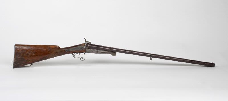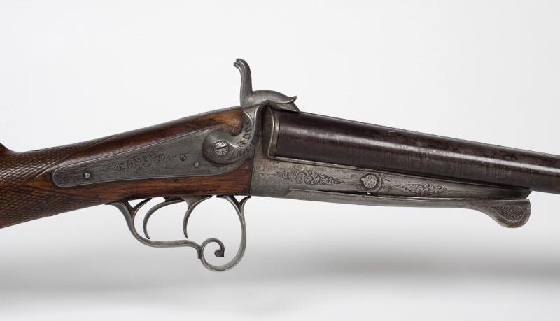 Slaglås med stiftantändning. Bakladdat. Runda slätborrade pipor. Halvstock. Kolven har kindstöd Hane o beslag har graverad rankornamentik. Vapennummer 12943.