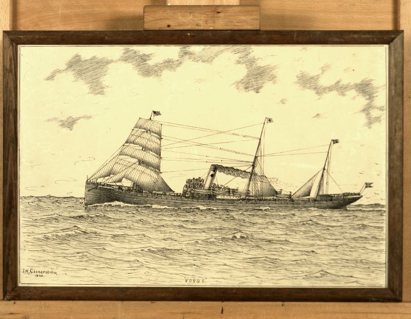 • Tuschteckningav ång- och segelfartyget NORGE avbildat i profil åt vänster under seglats på öppet hav.