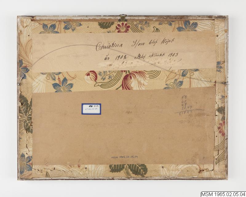 Påskrift på monteringskartong centrerat under fotot: CHRISTINE / E. Skog. Påskrift på bakstycket: Christina Hon blef köpt / år 1902 Blef skänkt 1903 / ... (bortskrapad text).