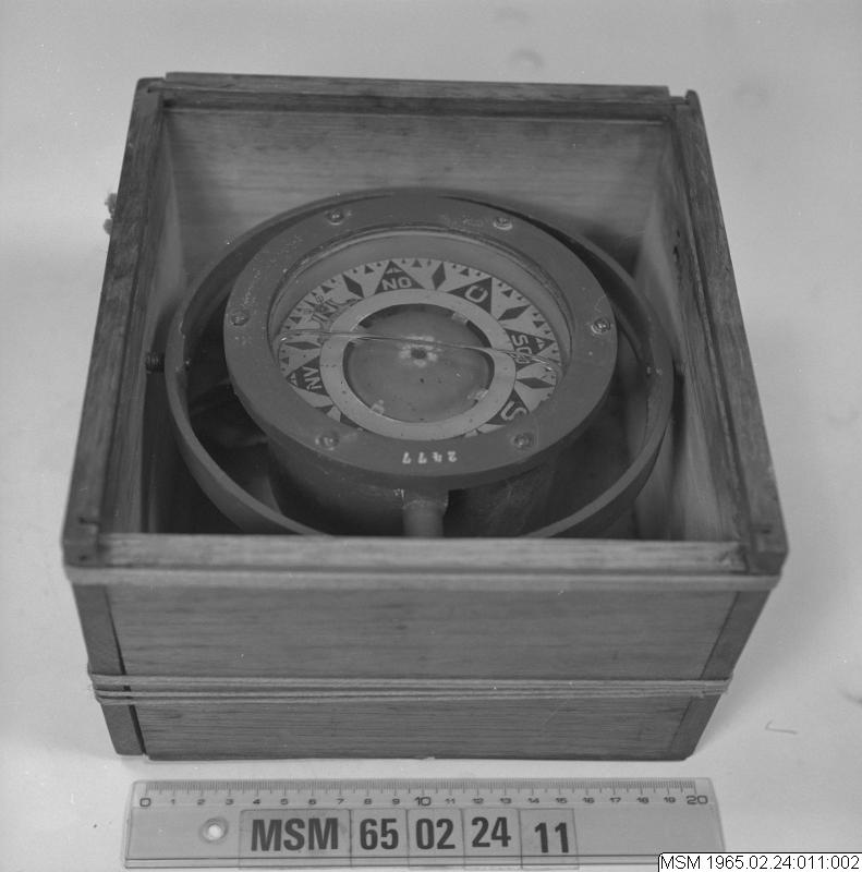 • Kompass, Marinkompass med certifikat och karta över Malmö hamn. Patent Lemcke. Kardanupphängd i låda. Nr. 2942.