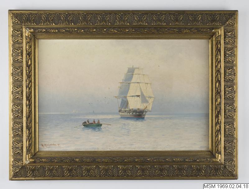 • Oljemålning, Marinmålning, motiv: fullriggat fartyg i stiltje. Oljemålning på duk, bred förgylld gipsram. Konstnär Ludwig Richarde 1891.