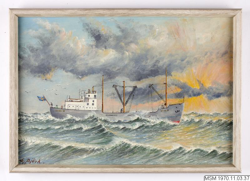 • Fartygsprträtt, ms VIKA II, rederi Skånska Cement AB, BFH B.O. Lundquist. Oljemålning. Konstnär S. Björk 1949. Utan ram.