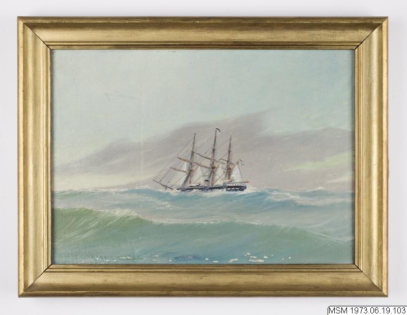 • Fartygsporträtt: korvetten SAGA i storm. Marinmålning i olja, ram. Konstnär: Henrik Löfgren.
