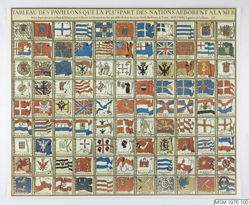 • Flaggkarta kopparstick av Bellini, Nantes, år 1756. Nytryck, handkolorerat.