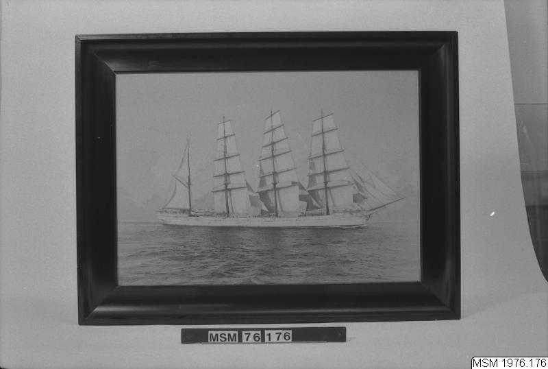 Handkolorerat svartvitt fotografi, dessutom förstärkt med linjer och skuggningar i blyerts. Motivet är en fyrmastad bark, avbildad i profil med fören åt höger. Fotot är mycket bleknat. Konturlinjer kring seglen samt rep, tåg, skot och andra små detaljer har förstärkts med blyertspenna, likväl som skuggningarna på seglen. Färgförstärkningarna är svaga, mestadels blått, större delen av fartyget har ...